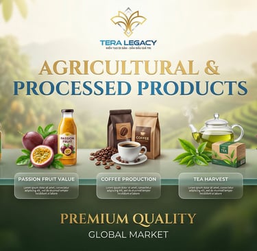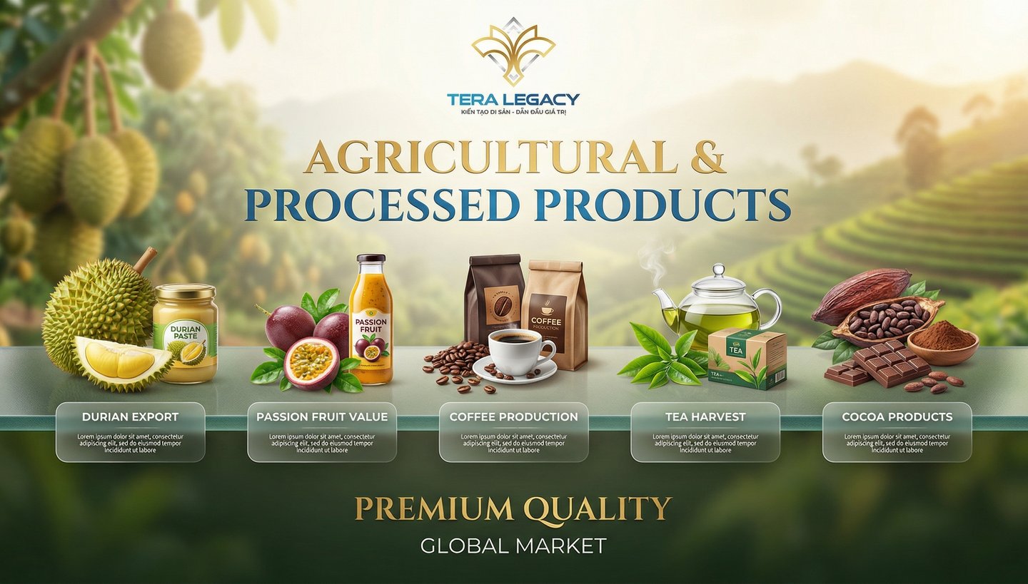 Trong lĩnh vực nông sản và thực phẩm chế biến, TERA LEGACY GROUP tập trung phát triển các mặt hàng có lợi thế cạnh tranh và giá trị xuất khẩu cao của Việt Nam như sầu riêng, chanh dây, cùng các sản phẩm cà phê, chè, cacao và thực phẩm chế biến.