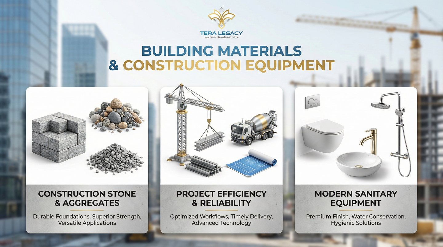 TERA LEGACY GROUP cung cấp và phân phối các vật liệu xây dựng chủ lực như đá xây dựng, cùng các thiết bị vệ sinh và vật tư hoàn thiện phục vụ cho các công trình dân dụng, công nghiệp và hạ tầng.